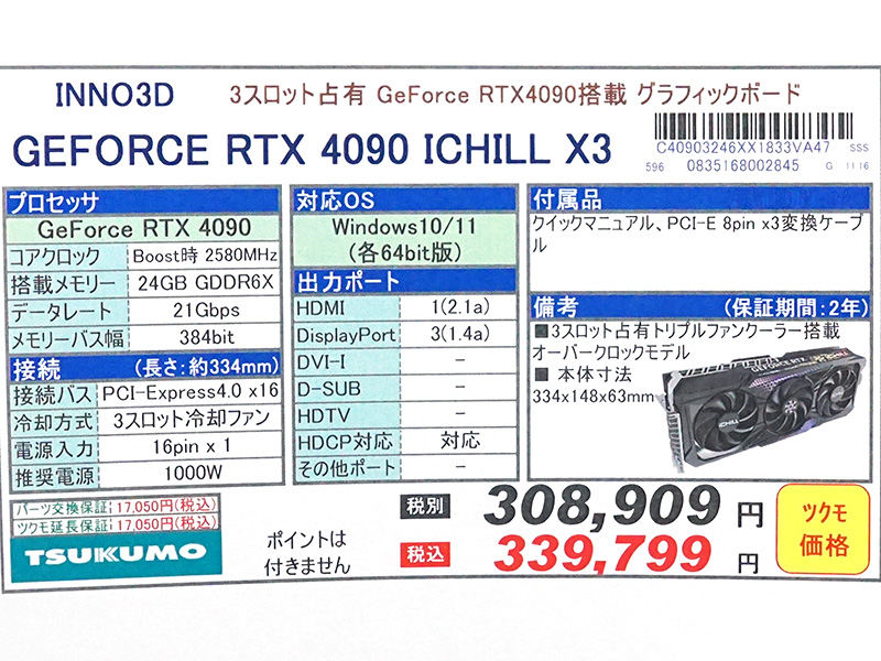 INNO3Dの「GeForce RTX 4090 iChill X3」が入荷、価格は約34万円