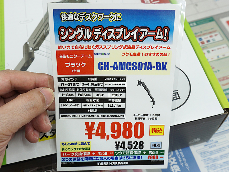 ガススプリング式の1画面用ディスプレイアームがグリーンハウスから