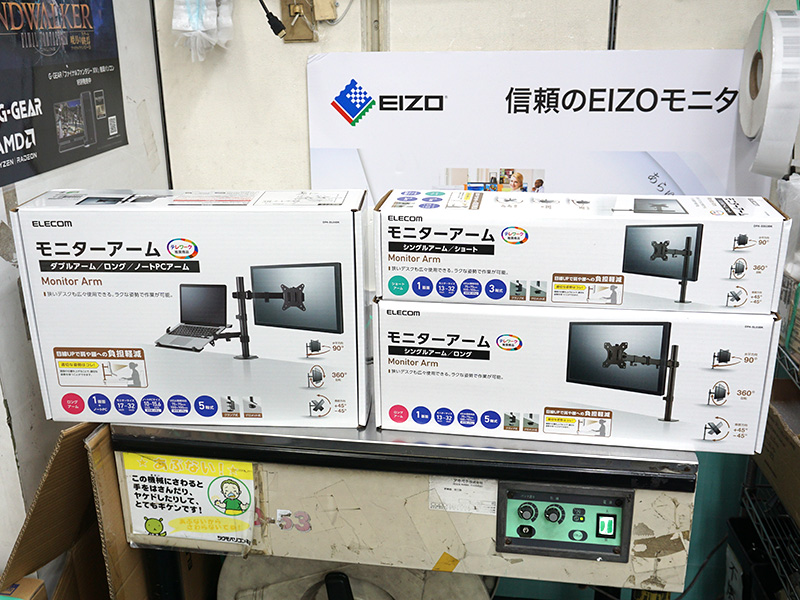 ノートPCとモニターが設置できるデュアルアームなど、エレコムのモニターアームが3種類