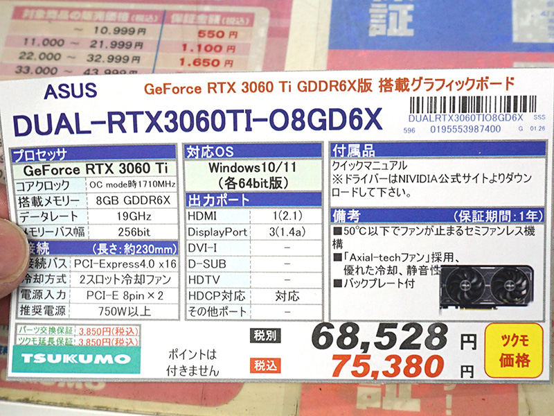 ASUSのGDDR6Xメモリ版GeForce RTX 3060 Tiが2製品、価格は75,380円から
