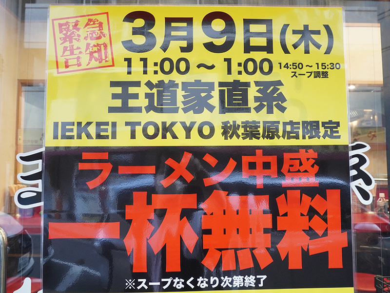 末広町駅近くの「IEKEI_TOKYO王道家直系」がラーメン中盛りを1杯無料提供、3月9日限定のイベント