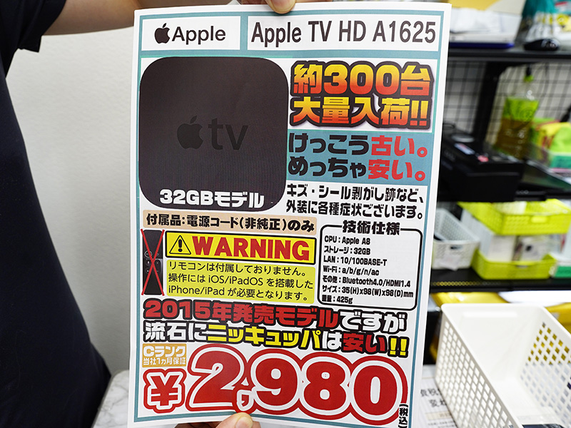 「Apple TV HD」のCランク中古品が2,980円!イオシスに約300台入荷