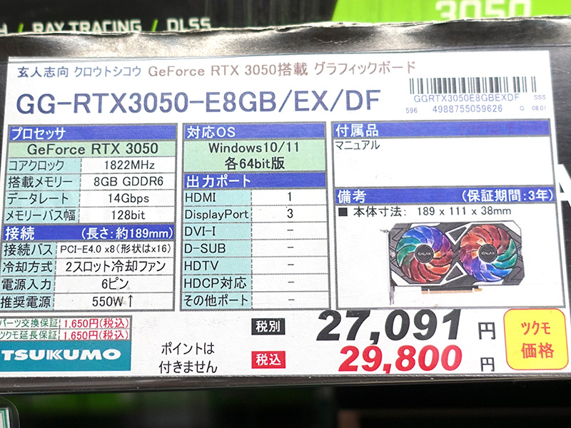 実売29,800円のGeForce RTX 3050が玄人志向から、発光機能のON/OFFスイッチ搭載