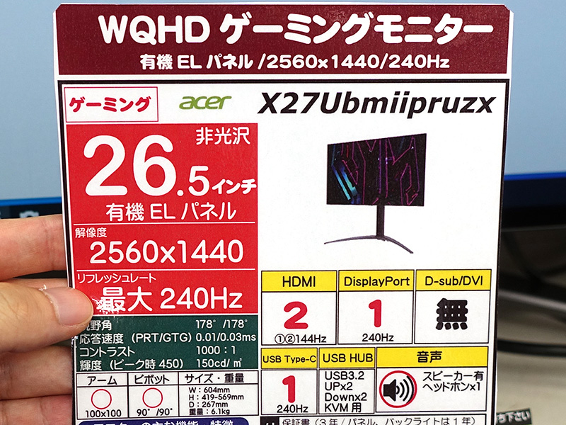 26.5インチWQHD有機ELゲーミングモニター「Predator X27U」が発売、240Hz駆動
