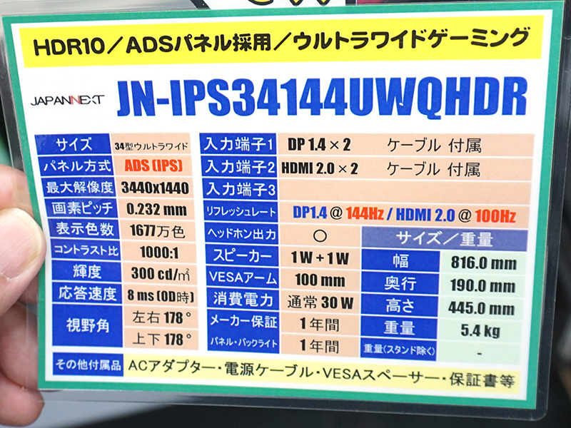 144Hz駆動の34インチUWQHDゲーミングモニターがJAPANNEXTから、価格は44,980円