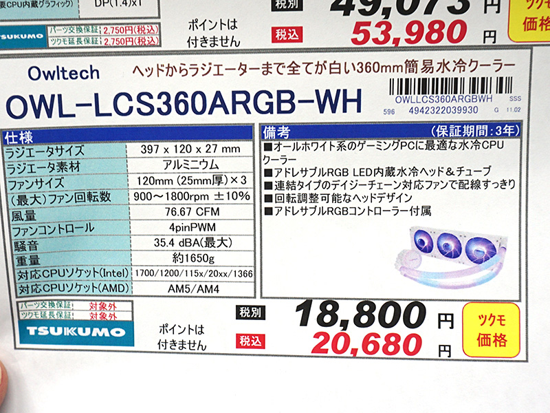 チューブも光るホワイトカラーの簡易水冷クーラーがオウルテックから