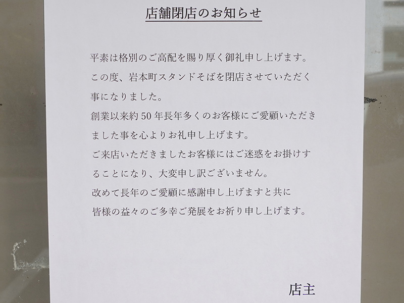 創業約50年の老舗そば屋「岩本町スタンドそば」が閉店