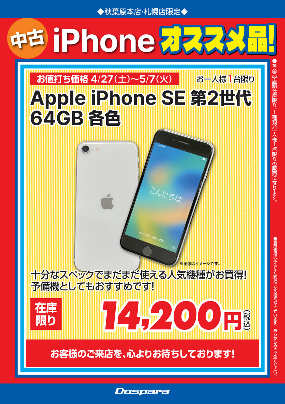 「第2世代iPhone SE 64GB」が14,200円!ドスパラ秋葉原本店で中古品の数量限定セール