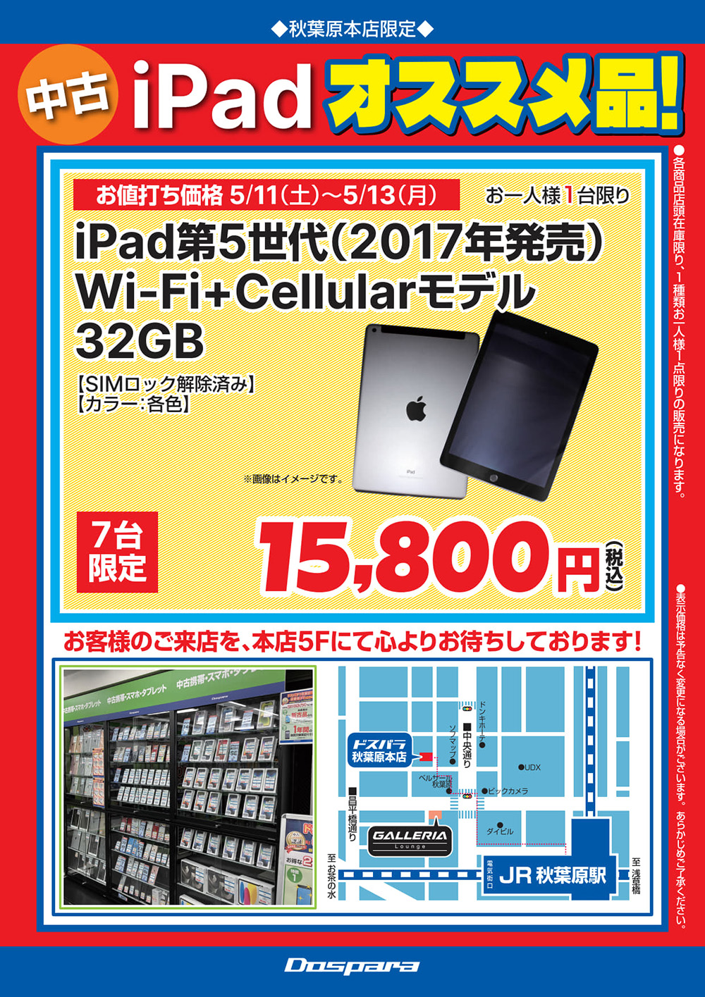 「第5世代iPad Wi-Fi+Cellularモデル」の中古品が15,800円!ドスパラ秋葉原本店で数量限定セール