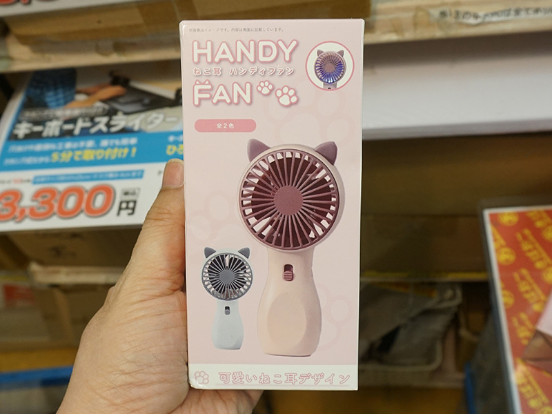 可愛らしい猫耳デザインのハンディ扇風機が800円、LED搭載