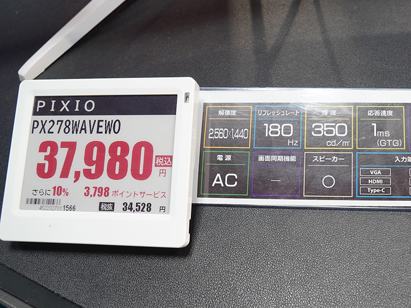 白い27インチWQHDゲーミングモニター「PX278WAVEW」、ソフマップで展示中