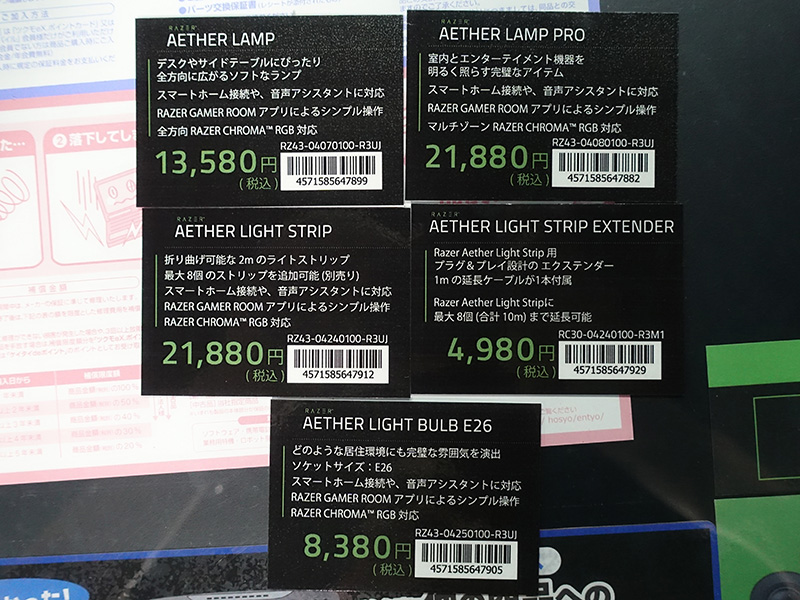 Razer Aether Lamp ProAmazonで購入楽天で購入Razer Aether LampAmazonで購入楽天で購入Razer Aether Light Bulb E26Amazonで購入楽天で購入Razer Aether Light StripAmazonで購入楽天で購入Razer Aether Light Strip ExtenderAmazonで購入楽天で購入