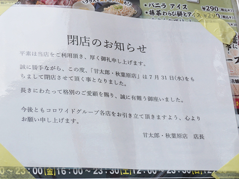 トゥモロービル7階の「手作り居酒屋 甘太郎 秋葉原店」が7月31日で閉店