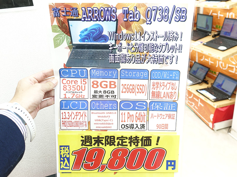 Windows 11対応の2in1タブレット「ARROWS Tab Q738/SB」が19,800円!PCコンフルで中古PCセール