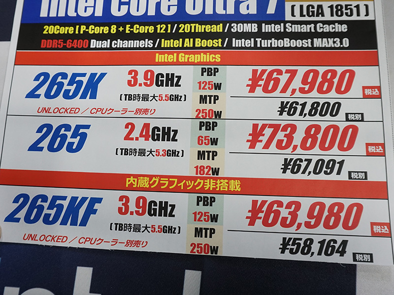 Arrow Lake-Sの新モデル「Core Ultra 7 265」が発売、“K付き”より高値
