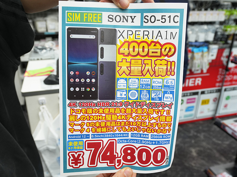 スリムで持ちやすい6.5型スマホ「Xperia 1 IV」が74,800円!未使用品が400台も入荷