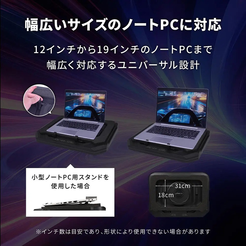 • スマホスタンド搭載の光るノートPC用クーラー、RGBファン×2基搭載