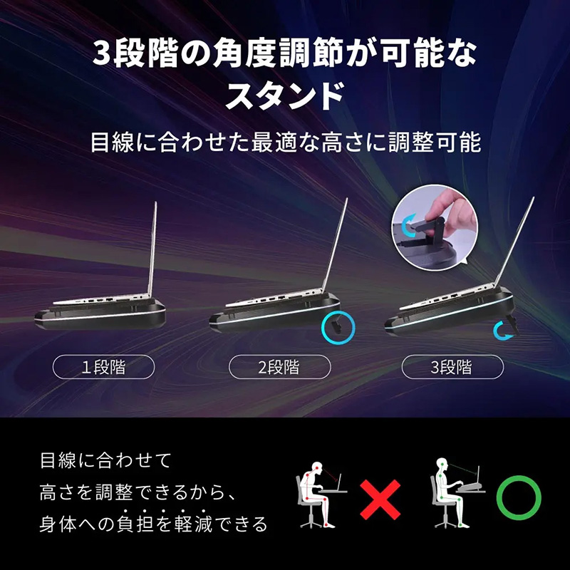 スマホスタンド搭載の光るノートPC用クーラー、RGBファン×2基搭載