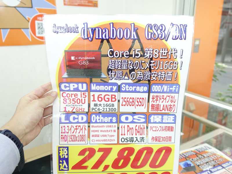 第8世代Core i5+メモリ16GB搭載の「dynabook G83/DN」が27,800円、中古PCセール