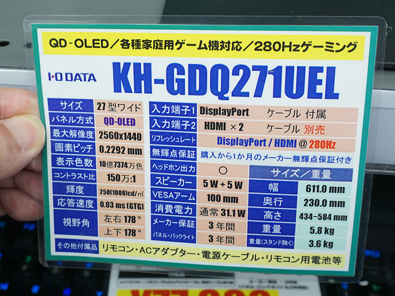 280Hz対応の27インチWQHD有機ELモニター「KH-GDQ271UEL」がアイ・オーから(6/7)