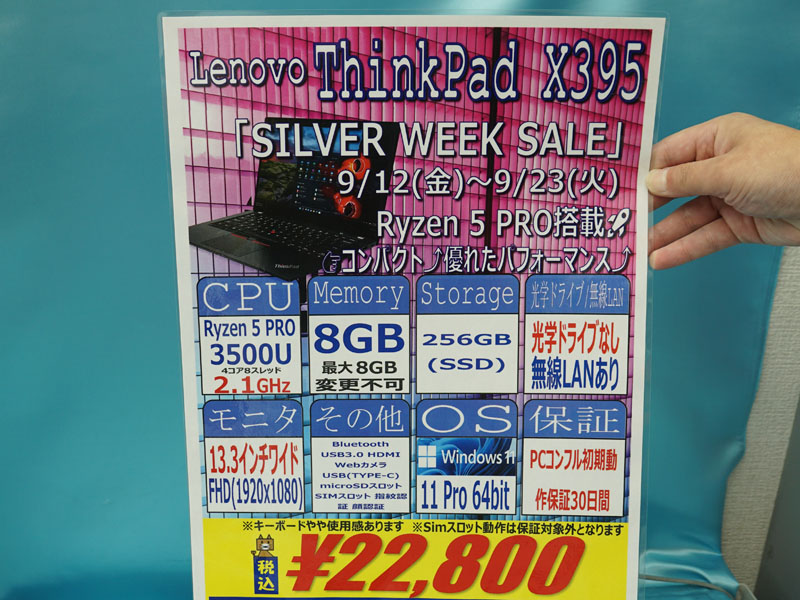 Ryzen 5 PRO搭載の「ThinkPad X395」が22,800円、中古PCセール
