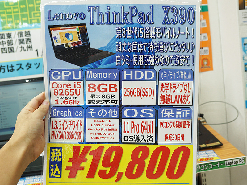 Core i5-8265U+Windows 11 Pro搭載の「ThinkPad X390」が19,800円!中古PCセール