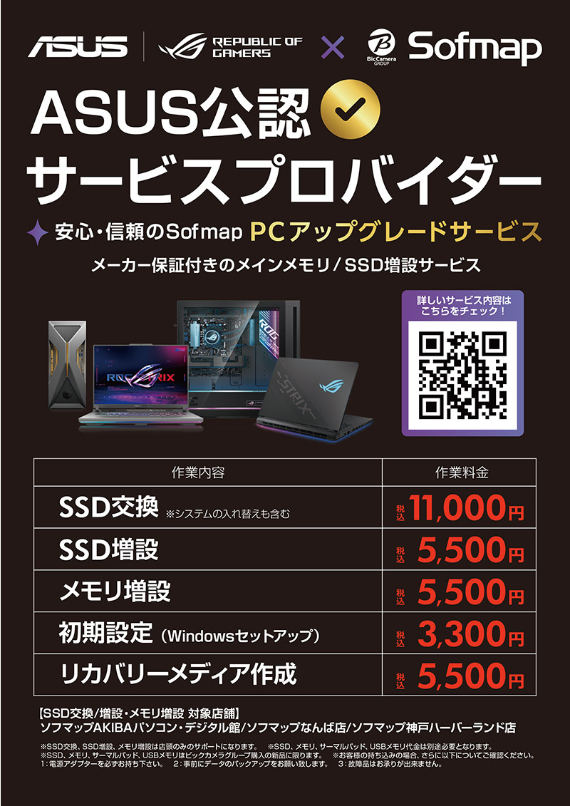 ソフマップの一部店舗が「ASUS公認サービスプロバイダー」に認定、ASUS製PCの本体カスタマイズが可能に