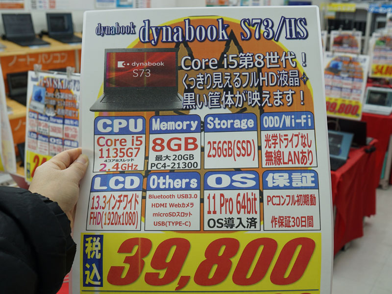 Core i5-1135G7搭載の13.3型ノート「dynabook S73/HS」が39,800円、中古PCセール