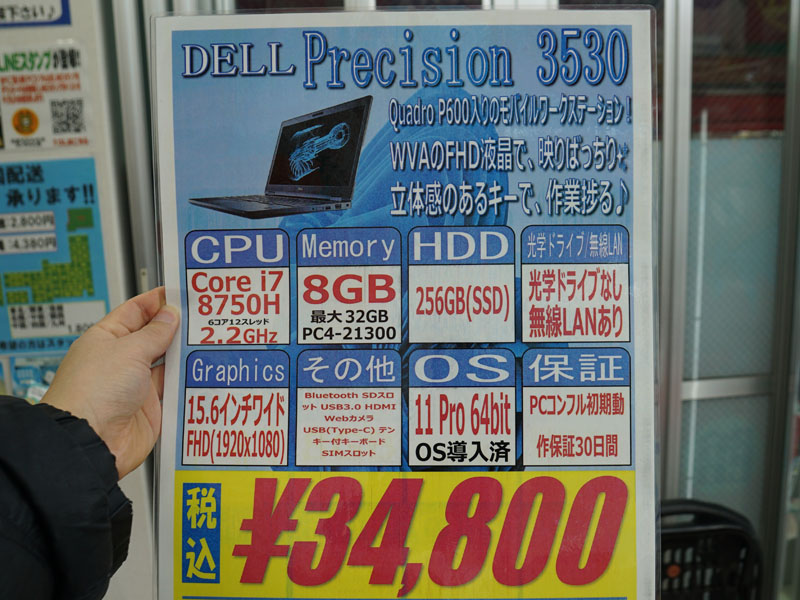 Quadro P600搭載の15.6型ノート「Precision 3530」が34,800円、中古PCセール