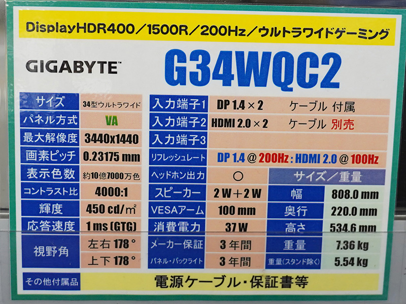 • GIGABYTEの34インチ曲面ゲーミングモニター「G34WQCP」が入荷、価格は56,800円