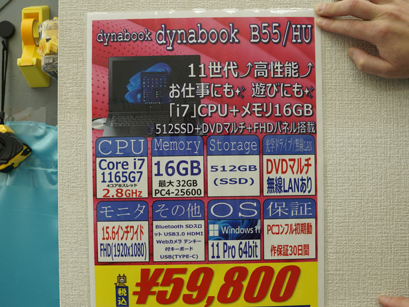 第11世代Core i7+メモリ16GB搭載の15.6型dynabookノートが59,800円、中古PCセール