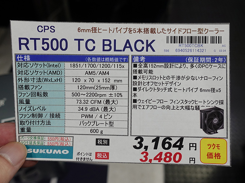 CPSの黒いサイドフロー型CPUクーラー「RT500 TC BLACK」が登場
