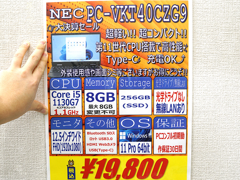 第11世代Core搭載のNEC製12.5インチノートが19,800円!訳あり中古PCセール