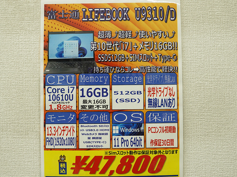 Core i7-10610U+16GBメモリ搭載の13.3型「LIFEBOOK U9310/D」が47,800円!中古PCセール
