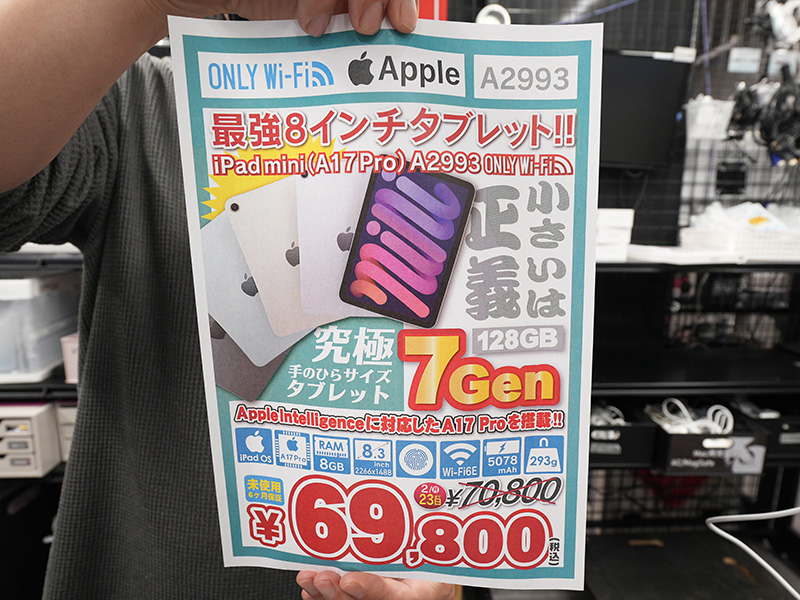 「iPad mini 7 Wi-Fi 128GB」が69,800円!未使用品の期間限定セール
