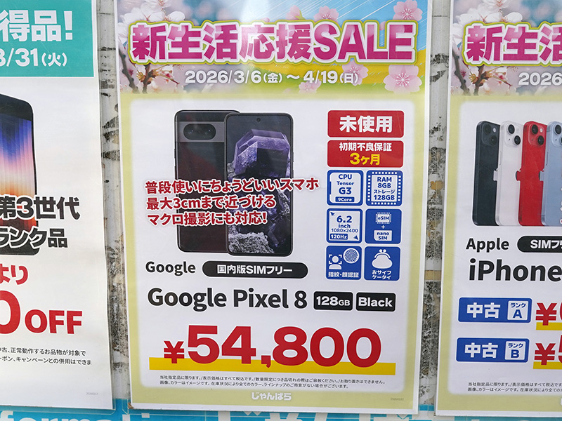 Googleの6.2インチスマホ「Pixel 8」が54,800円!未使用品セール