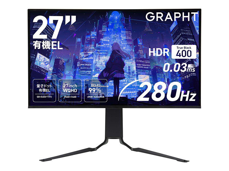 280Hz駆動QD-OLEDパネル採用の27インチWQHDゲーミングモニター「GR2728OEL-BK」がGRAPHTから