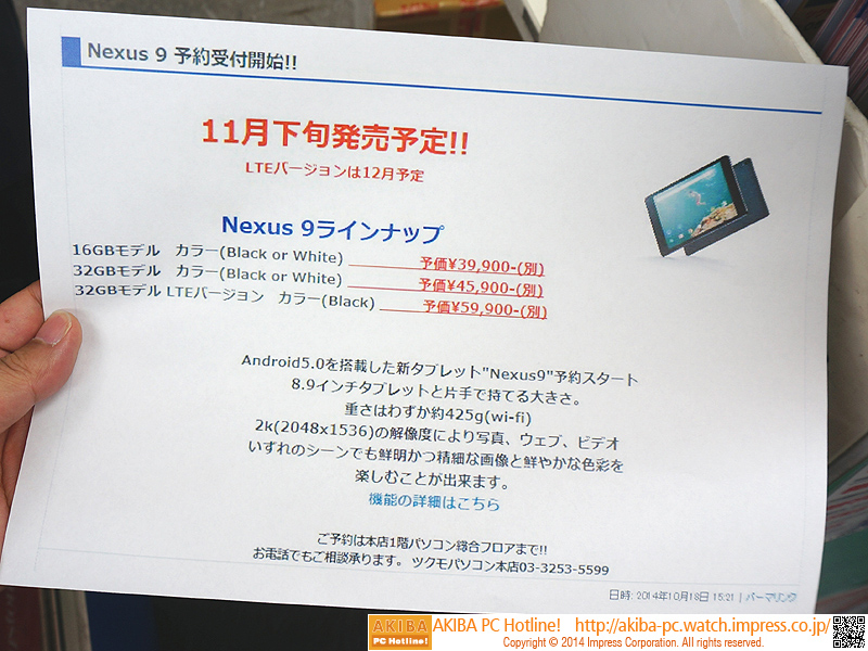 HTC、Android 5.0搭載「Nexus 9」を11月下旬から国内販売